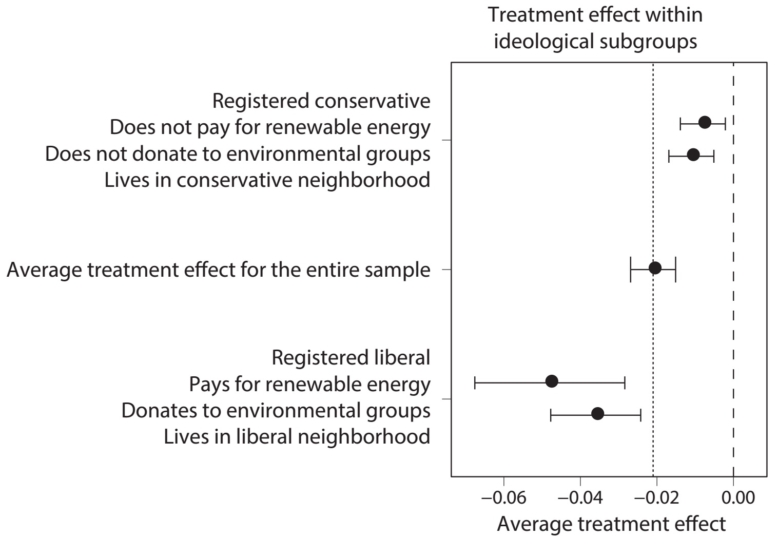 As one illustration, Costa and Kahn (2013) examined how people’s change in energy use in response to a home energy report varied with their political ideology. Their analysis is summarised in the following chart.