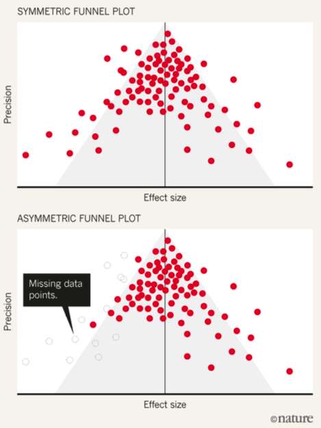 A literature in which all experimental results are published should see a spread of results around the effect size, with smaller or less precise studies having more variation around that point. This results in a funnel shape of results, as in the first diagram.