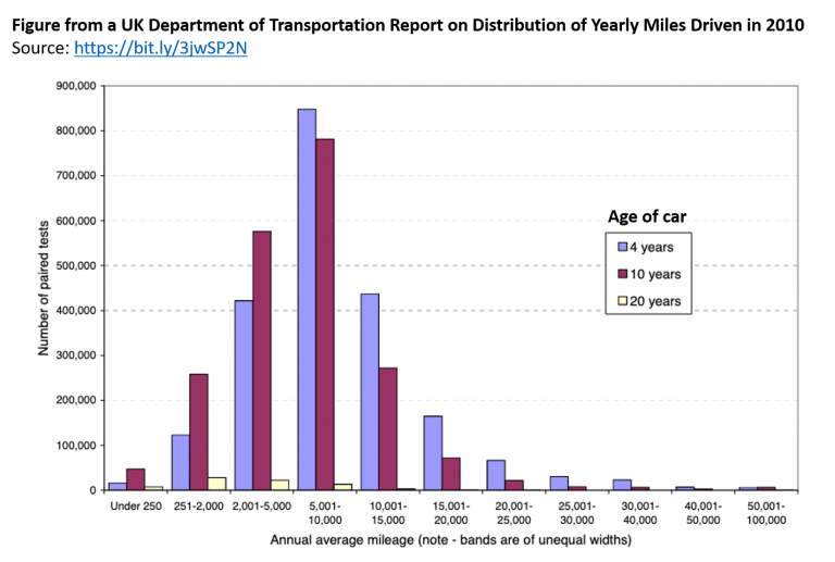 Let’s first think about what the distribution of miles driven should look like. If there were about a year separating the Time 1 and Time 2 mileages, we might expect something like the figure below, taken from the UK Department of Transportation (.pdf) based on similar data (two consecutive odometer readings) collected in 2010: