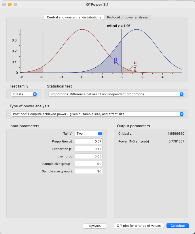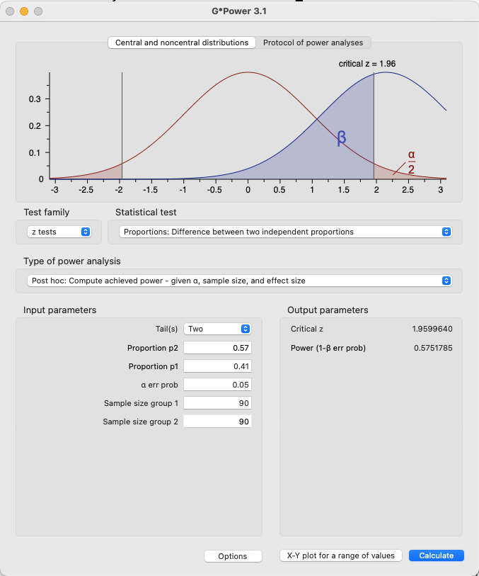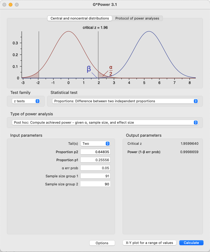 In G*Power, we select the type of test that was conducted (z-test, difference between two independent proportions) and select the analysis as a post hoc calculation of achieved power. Pressing calculate gives us the result and a graph of the distributions.