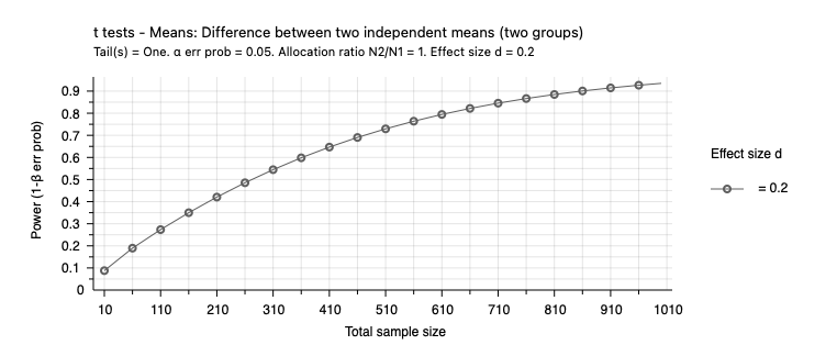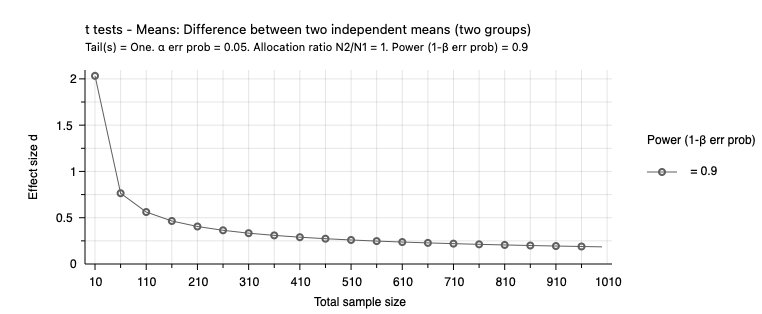 The two graphs below graphs, drawn with the G*Power software, show how power and the minimum detectable effect size change with sample size. Both graphs assume a significance level of 0.05. The first graph uses the power determination approach and plots power against sample size for an effect size of 0.2. It shows that power increases with sample size. It also shows that we have more power for the same sample size when the effect size is larger. The second graph uses the effect size approach and plots the effect size against the sample size for 90% power. It shows that for a given level of power, we can detect a smaller effect size when the sample size is larger.